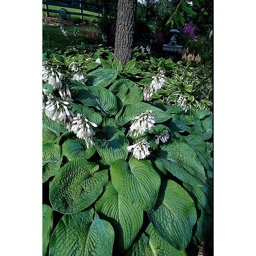 Hosta Elegans (Hosta sieboldiana 'Elegans') is a classic, giant blue hosta prized for its bold, heart-shaped, heavily textured leaves that emerge frosty blue and mature to smoky blue-green by mid-summer. This shade-loving perennial forms a dramatic, dense mound that makes a stunning focal point in woodland gardens, borders, or as a ground cover under trees. In early to midsummer, tall scapes rise above the foliage, topped with clusters of fragrant, near-white to pale lavender, bell-shaped flowers that attract hummingbirds and pollinators. Exceptionally low maintenance and slug resistant, Hosta Elegans thrives in rich, moist, well-drained soil and brings elegance and structure to any shady spot.