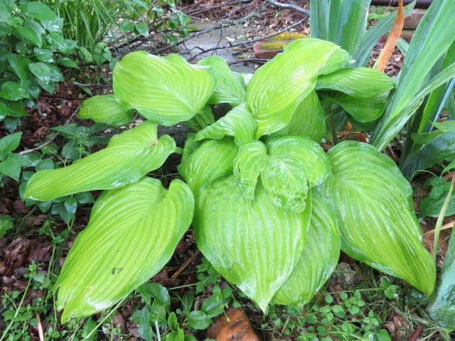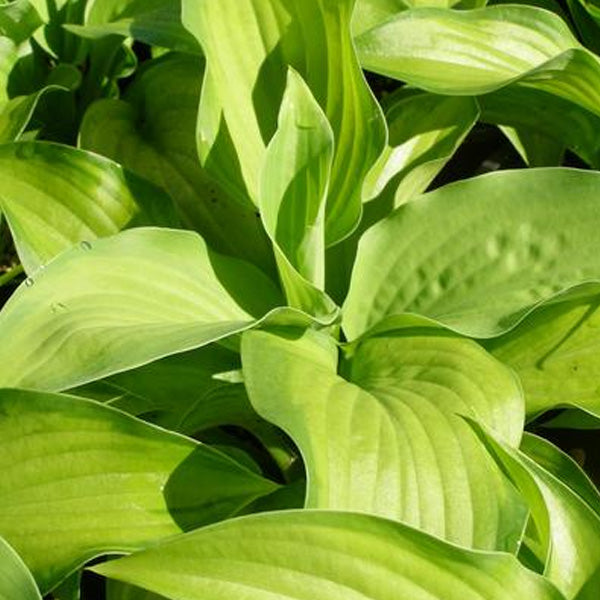 Hosta Guacamole (Hosta 'Guacamole') is a large, award-winning perennial prized for its vibrant, apple-green to chartreuse leaves with wide, dark green margins—reminiscent of a freshly sliced avocado. The foliage color intensifies as the season progresses, creating a dazzling effect in shaded gardens. In late summer, tall scapes rise above the mound, bearing large, fragrant white to pale lavender flowers that attract hummingbirds and pollinators. This vigorous, sun-tolerant hosta forms a dense, rounded mound and is perfect for borders, mass plantings, or as a specimen in shade to part sun.