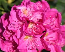 Large, rounded trusses of rosy pink, trumpet-shaped flowers with golden yellow blotches (mid to late spring)